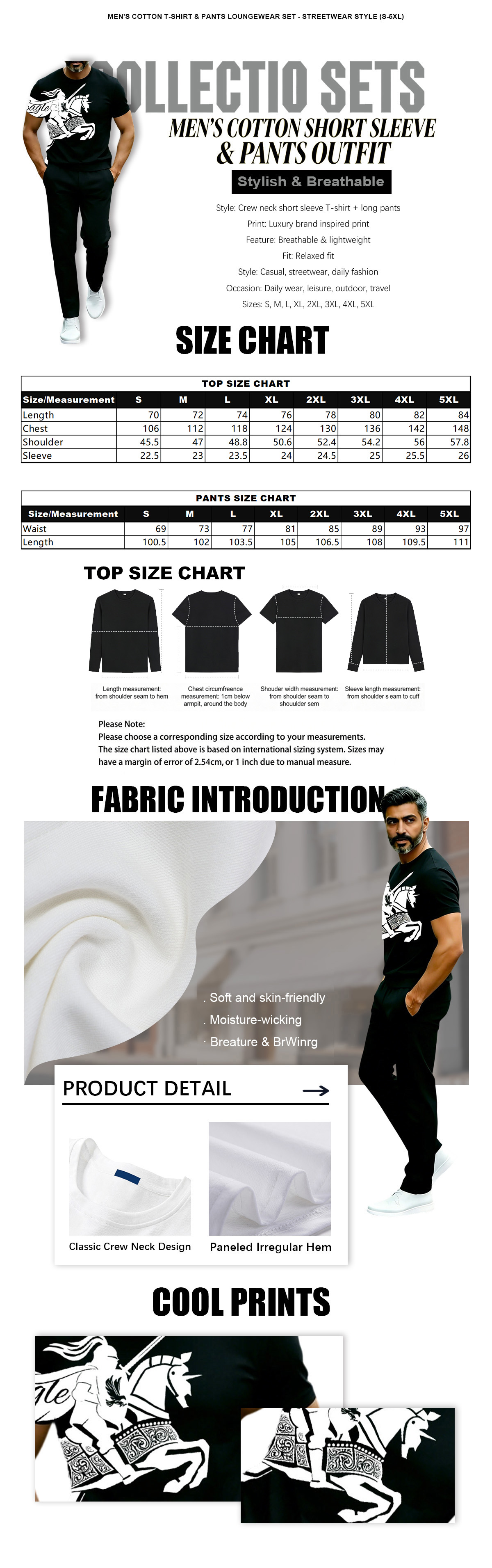 This short sleeve crew neck T-shirt and long pants two-piece set features luxury brand inspired print design, stylish and eye-catching for daily and street wear. The outfit is lightweight and breathable, ensuring comfortable wearing experience all day long. With a relaxed fit and versatile casual style, it is perfect for daily outings, leisure, travel and street fashion. Available in sizes from S to 5XL, it fits various body shapes and is easy to match with any shoes. A must-have trendy essential for your wardrobe.