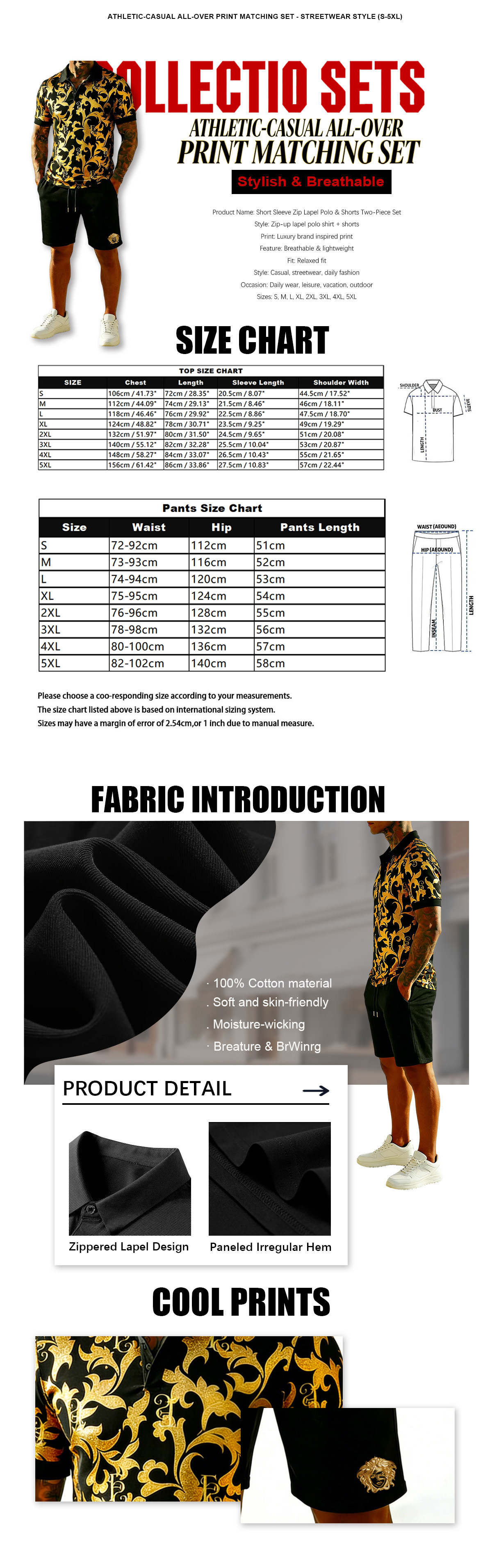 This two-piece outfit includes a short sleeve zip-up lapel polo shirt and matching shorts, decorated with luxury brand inspired print for a stylish and premium look. The set is lightweight and breathable, offering all-day comfort with a relaxed fit. Ideal for daily wear, casual outings, vacation and street fashion. Available in sizes S to 5XL to suit different body types, easy to match and a trendy essential for everyday wardrobe.