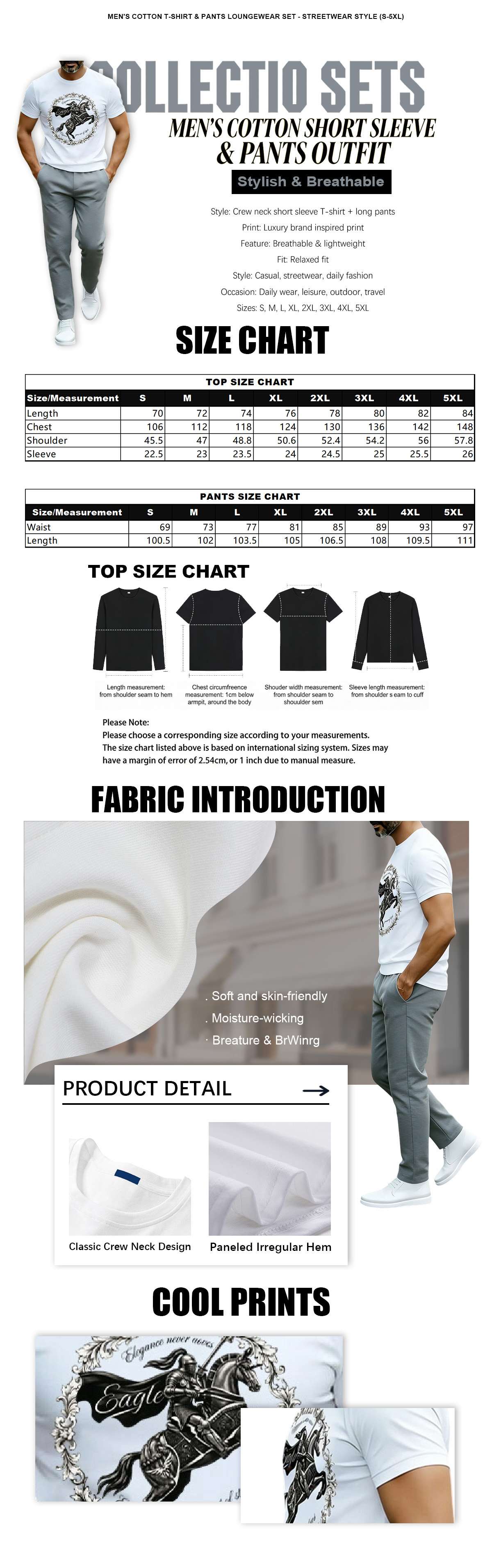 This short sleeve crew neck T-shirt and long pants two-piece set features luxury brand inspired print design, stylish and eye-catching for daily and street wear. The outfit is lightweight and breathable, ensuring comfortable wearing experience all day long. With a relaxed fit and versatile casual style, it is perfect for daily outings, leisure, travel and street fashion. Available in sizes from S to 5XL, it fits various body shapes and is easy to match with any shoes. A must-have trendy essential for your wardrobe.