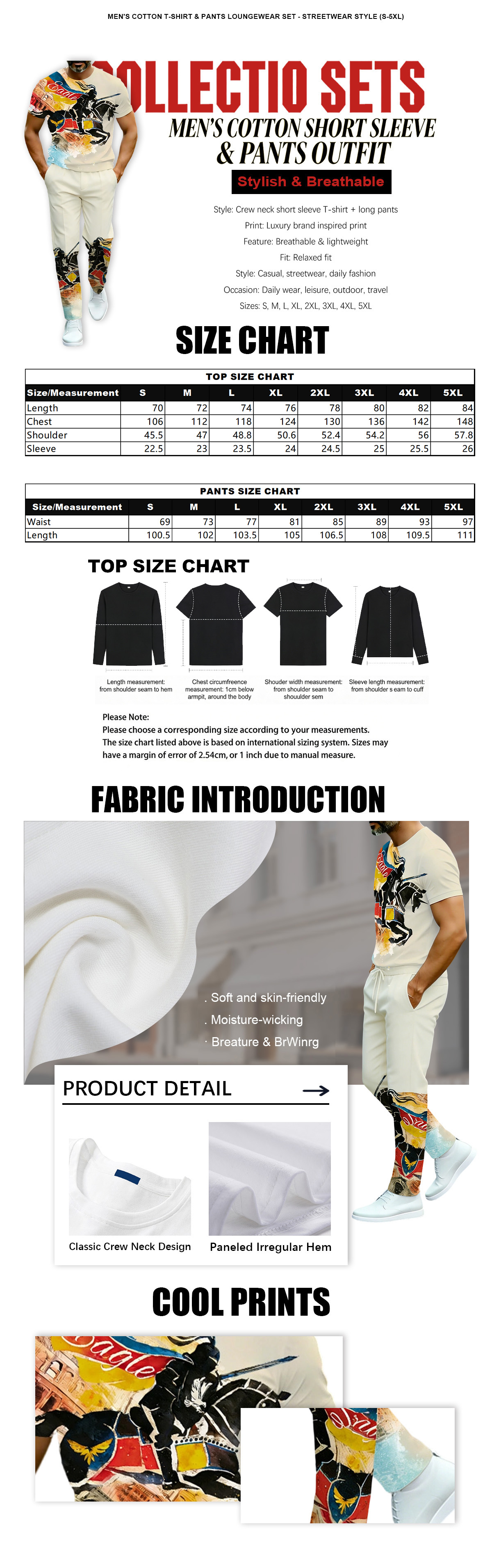 This short sleeve crew neck T-shirt and long pants two-piece set features luxury brand inspired print design, stylish and eye-catching for daily and street wear. The outfit is lightweight and breathable, ensuring comfortable wearing experience all day long. With a relaxed fit and versatile casual style, it is perfect for daily outings, leisure, travel and street fashion. Available in sizes from S to 5XL, it fits various body shapes and is easy to match with any shoes. A must-have trendy essential for your wardrobe.