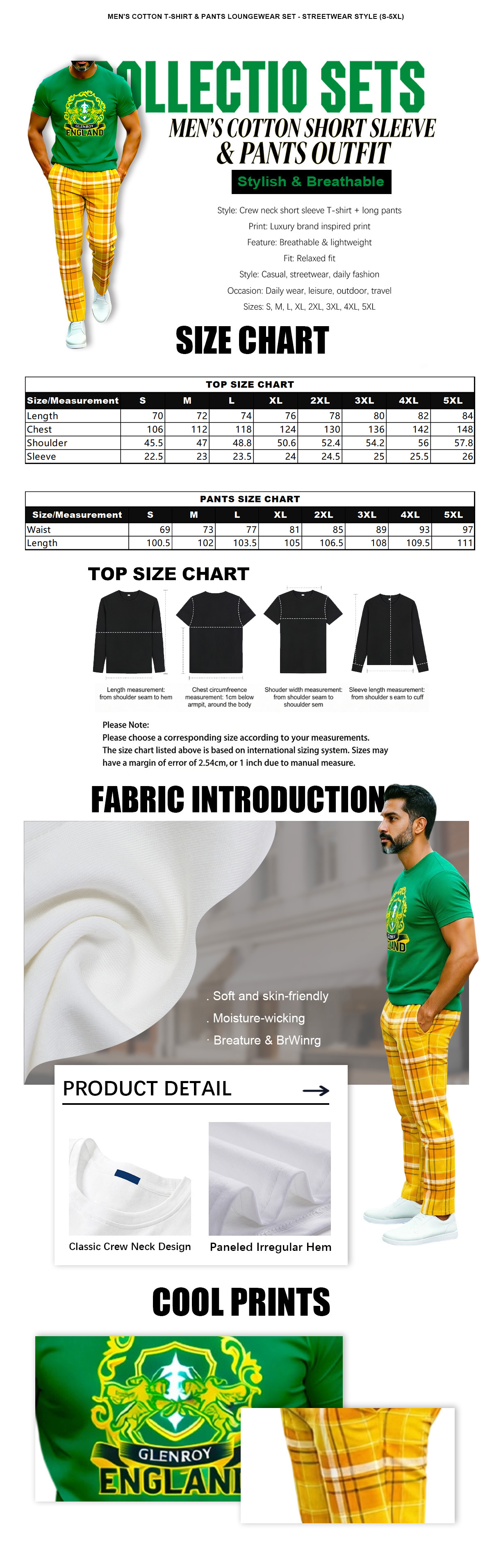 This short sleeve crew neck T-shirt and long pants two-piece set features luxury brand inspired print design, stylish and eye-catching for daily and street wear. The outfit is lightweight and breathable, ensuring comfortable wearing experience all day long. With a relaxed fit and versatile casual style, it is perfect for daily outings, leisure, travel and street fashion. Available in sizes from S to 5XL, it fits various body shapes and is easy to match with any shoes. A must-have trendy essential for your wardrobe.