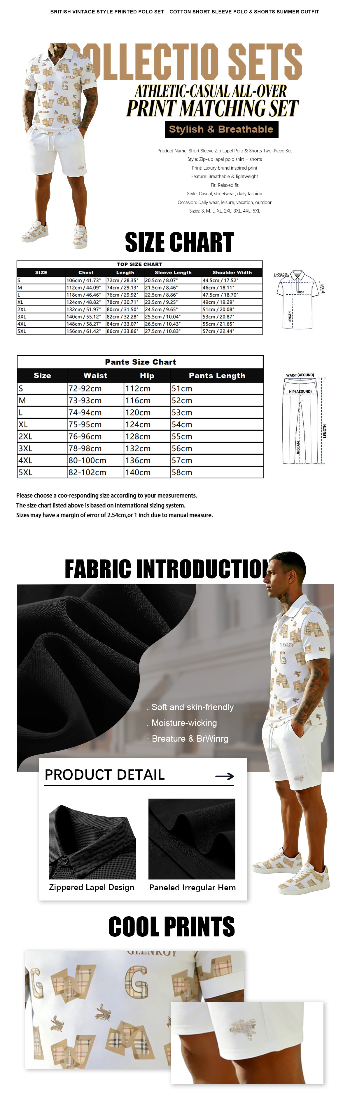This two-piece outfit includes a short sleeve zip-up lapel polo shirt and matching shorts, decorated with luxury brand inspired print for a stylish and premium look. The set is lightweight and breathable, offering all-day comfort with a relaxed fit. Ideal for daily wear, casual outings, vacation and street fashion. Available in sizes S to 5XL to suit different body types, easy to match and a trendy essential for everyday wardrobe.