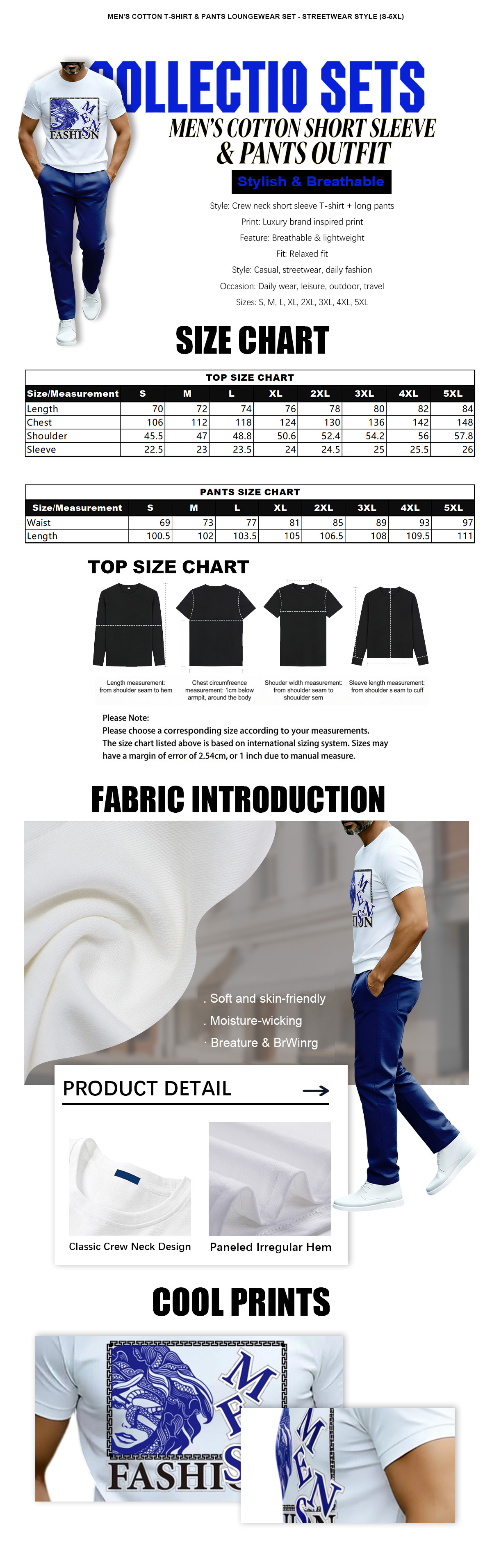 This short sleeve crew neck T-shirt and long pants two-piece set features luxury brand inspired print design, stylish and eye-catching for daily and street wear. The outfit is lightweight and breathable, ensuring comfortable wearing experience all day long. With a relaxed fit and versatile casual style, it is perfect for daily outings, leisure, travel and street fashion. Available in sizes from S to 5XL, it fits various body shapes and is easy to match with any shoes. A must-have trendy essential for your wardrobe.