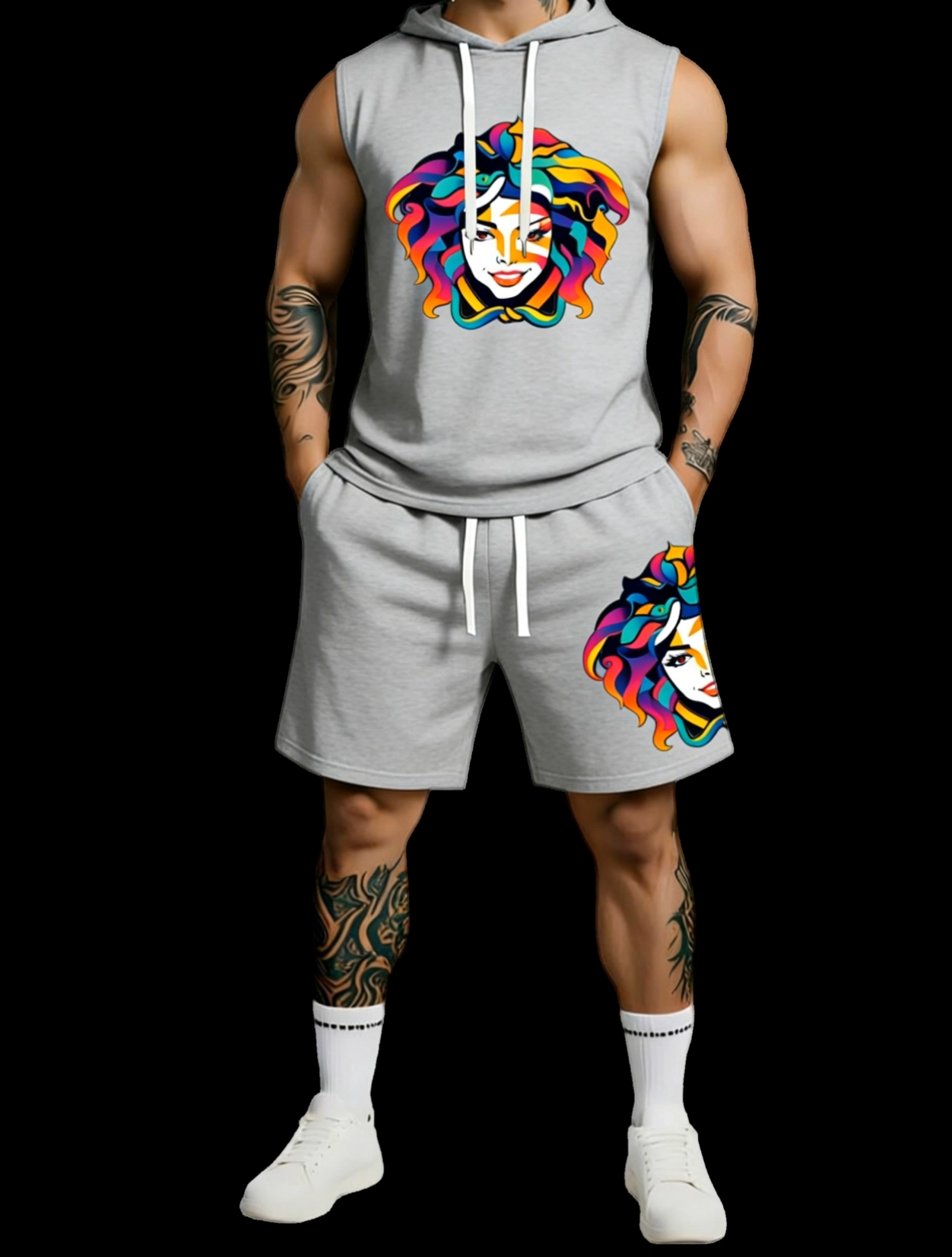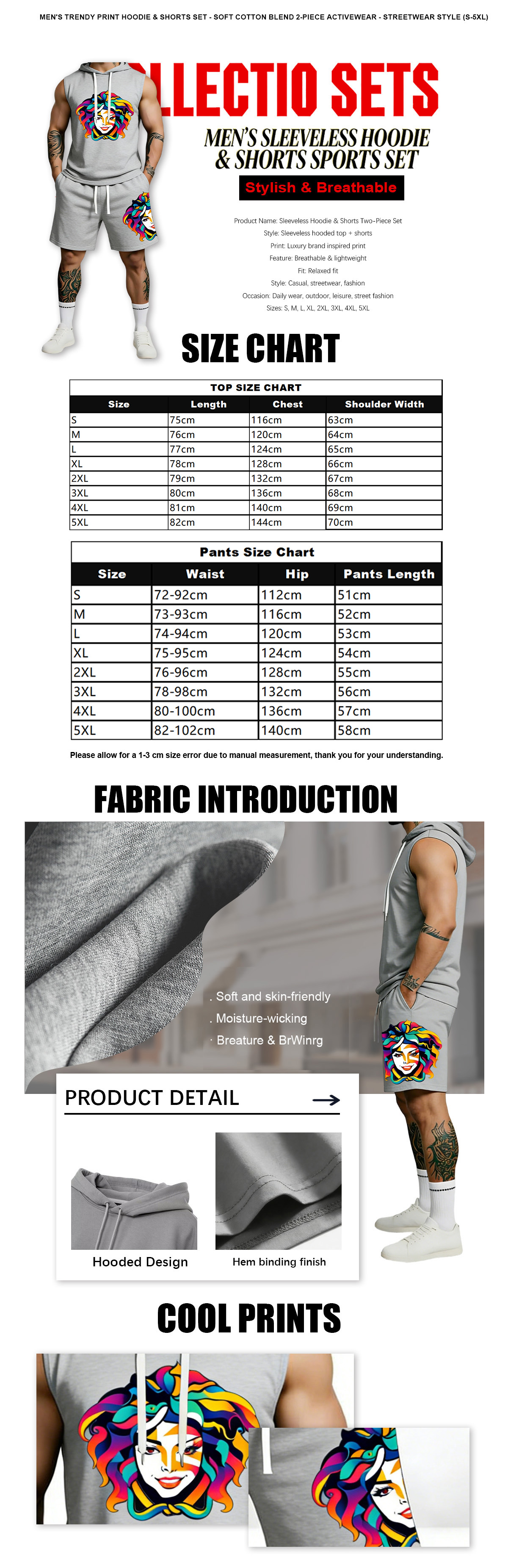 This sleeveless hoodie and shorts two-piece set features luxury brand inspired print design, stylish and eye-catching for modern streetwear. The outfit is lightweight and breathable, providing all-day comfort without restraint. With a relaxed fit and versatile casual style, it is perfect for daily wear, outdoor activities, street fashion and casual outings. Available in sizes from S to 5XL, this set suits various body types and is easy to match with any footwear. A must-have trendy essential for your wardrobe.