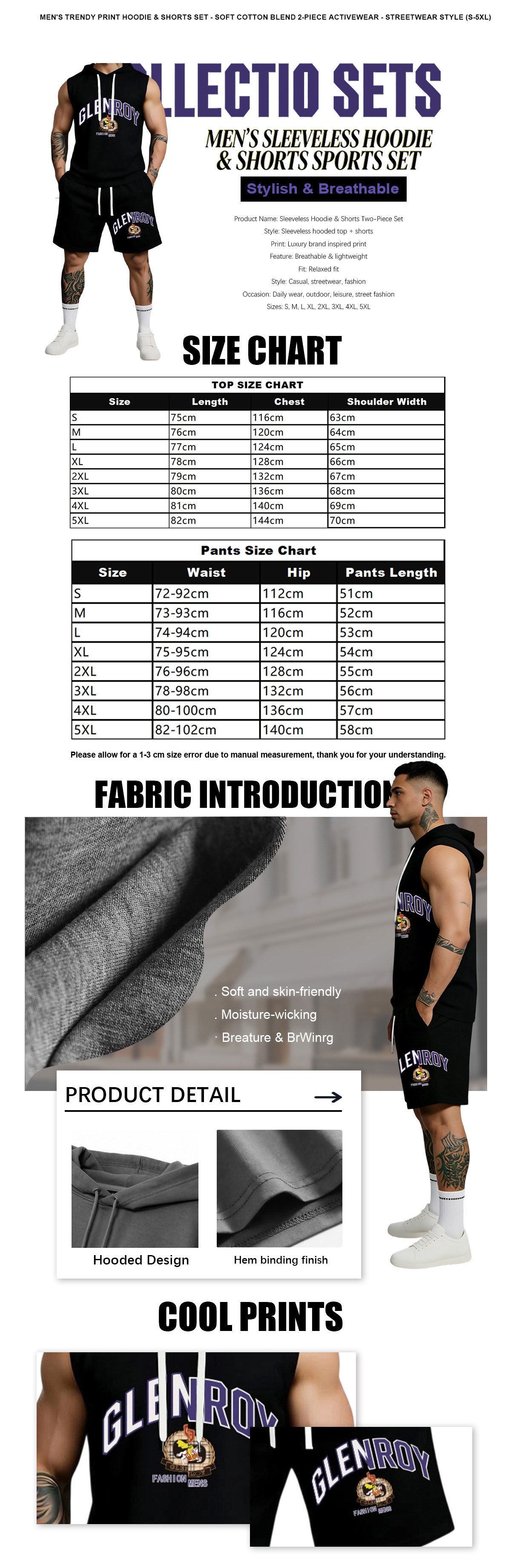 This sleeveless hoodie and shorts two-piece set features luxury brand inspired print design, stylish and eye-catching for modern streetwear. The outfit is lightweight and breathable, providing all-day comfort without restraint. With a relaxed fit and versatile casual style, it is perfect for daily wear, outdoor activities, street fashion and casual outings. Available in sizes from S to 5XL, this set suits various body types and is easy to match with any footwear. A must-have trendy essential for your wardrobe.