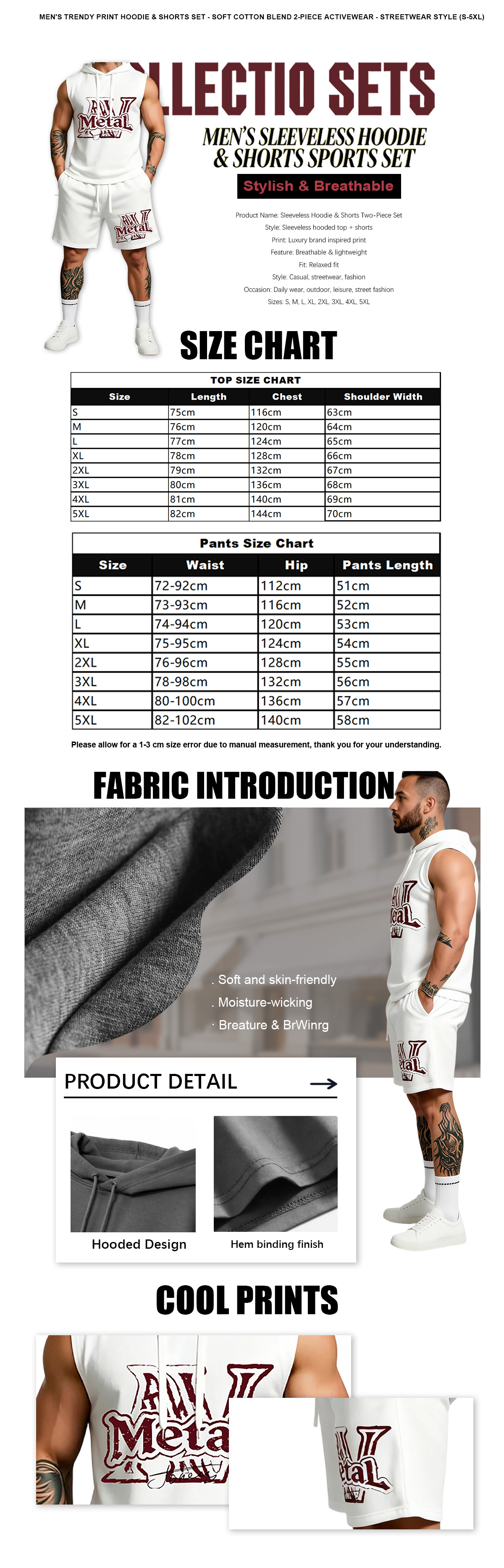 This sleeveless hoodie and shorts two-piece set features luxury brand inspired print design, stylish and eye-catching for modern streetwear. The outfit is lightweight and breathable, providing all-day comfort without restraint. With a relaxed fit and versatile casual style, it is perfect for daily wear, outdoor activities, street fashion and casual outings. Available in sizes from S to 5XL, this set suits various body types and is easy to match with any footwear. A must-have trendy essential for your wardrobe.