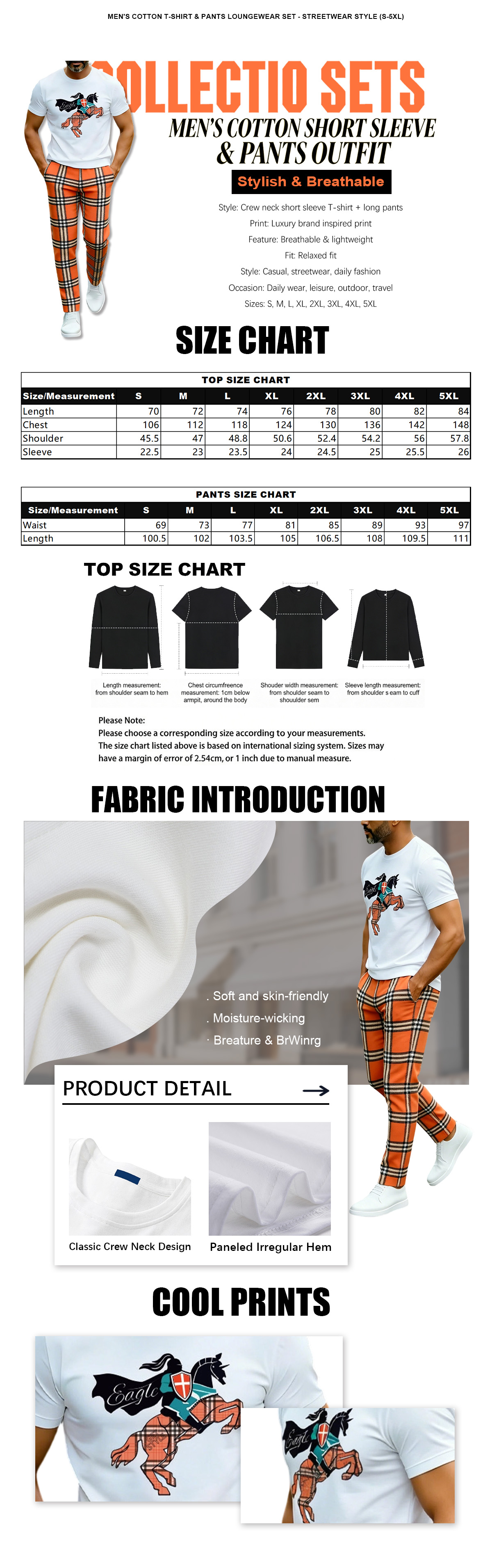 This short sleeve crew neck T-shirt and long pants two-piece set features luxury brand inspired print design, stylish and eye-catching for daily and street wear. The outfit is lightweight and breathable, ensuring comfortable wearing experience all day long. With a relaxed fit and versatile casual style, it is perfect for daily outings, leisure, travel and street fashion. Available in sizes from S to 5XL, it fits various body shapes and is easy to match with any shoes. A must-have trendy essential for your wardrobe.