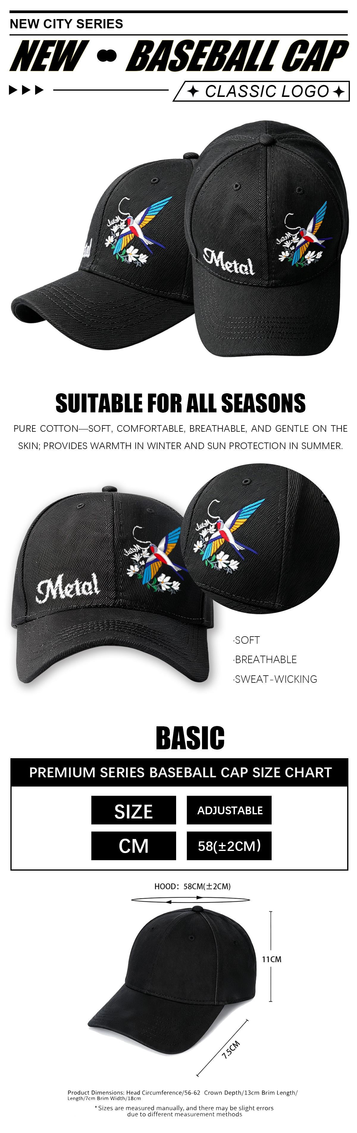 Trendy printed baseball cap with adjustable back closure, fits head circumference 58±2cm. Breathable fabric, curved brim for sun protection, stylish streetwear for daily and outdoor use. Unisex design.