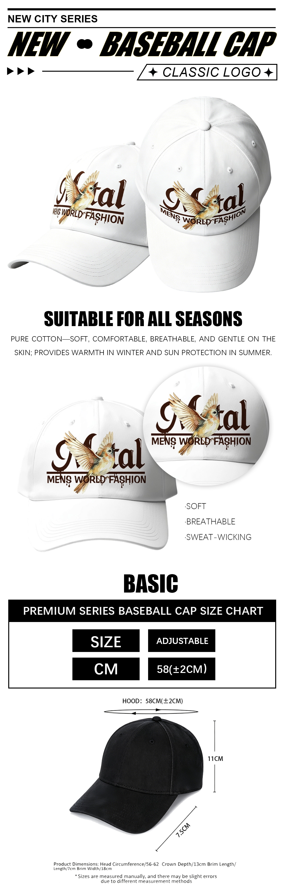 Trendy printed baseball cap with adjustable back closure, fits head circumference 58±2cm. Breathable fabric, curved brim for sun protection, stylish streetwear for daily and outdoor use. Unisex design.