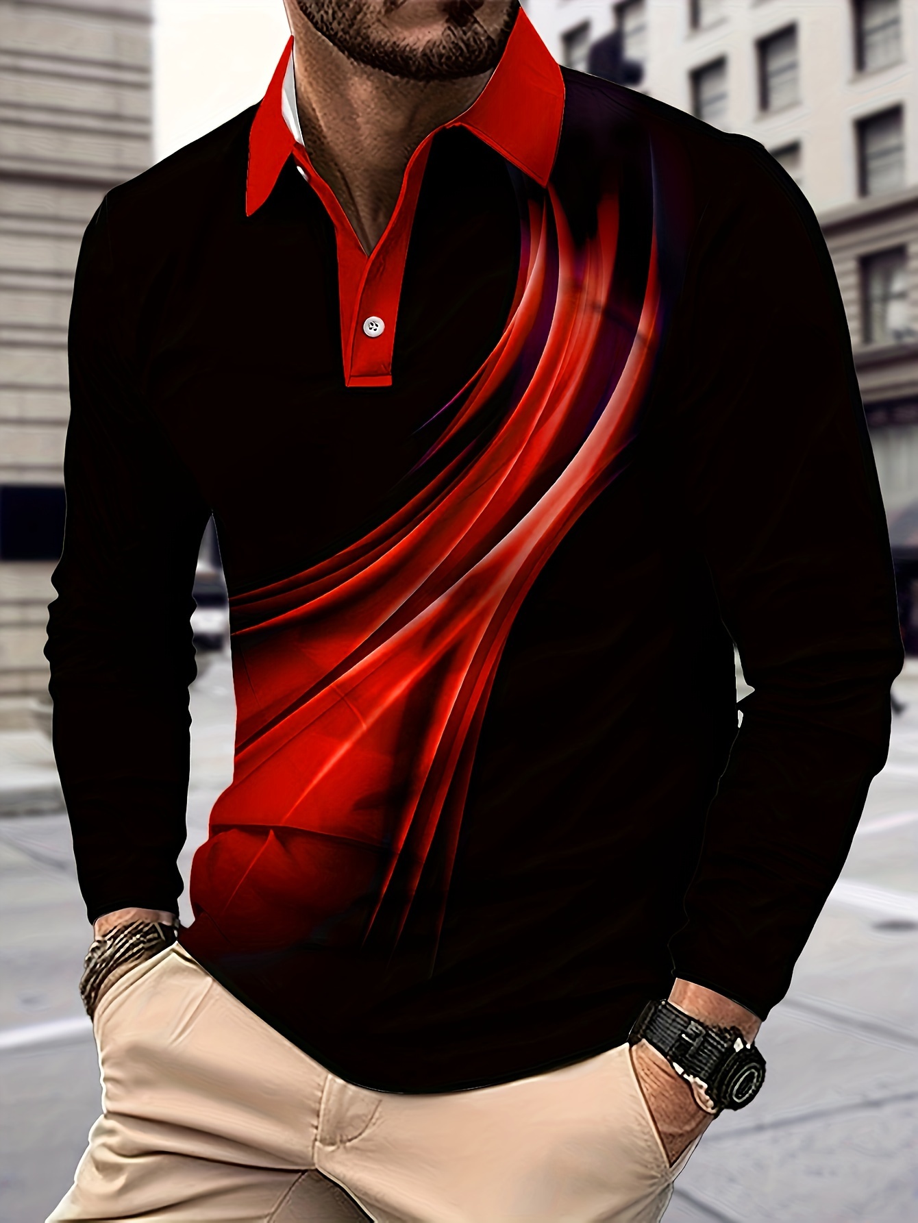 Men's Casual Black & Red Color Matching Printed Zipper Long Sleeved Polo Shirt
