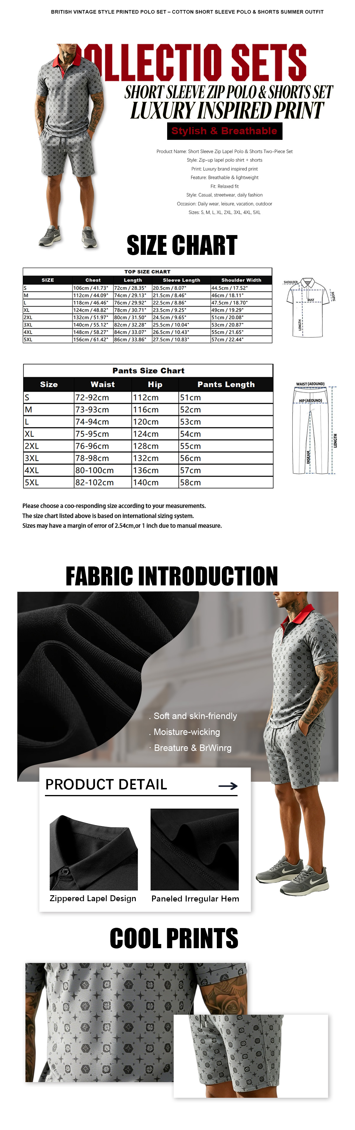 This two-piece outfit includes a short sleeve zip-up lapel polo shirt and matching shorts, decorated with luxury brand inspired print for a stylish and premium look. The set is lightweight and breathable, offering all-day comfort with a relaxed fit. Ideal for daily wear, casual outings, vacation and street fashion. Available in sizes S to 5XL to suit different body types, easy to match and a trendy essential for everyday wardrobe.